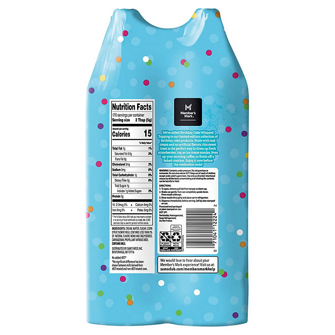 Birthday Cake Whipped Flavored Topping goes great on just about anything! Its rich flavor and creamy texture work well on cakes, pies, fruit, and your favorite warm beverage. The birthday cake flavor infused into this whipped cream enhances foods with the right amount of vanilla and the essence of sprinkles. Every bite will feel like a celebration!