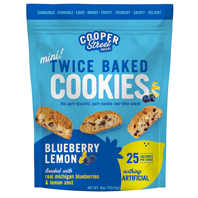 Cooper Street Blueberry Lemon Twice Baked cookies are only 30 calories per cookie, making them a guilt-free indulgence. They come in a resealable bag with approximately 60 cookies (18 servings) and are low in sugar and sodium. Enjoy the burst of flavor without worrying about your calorie intake.