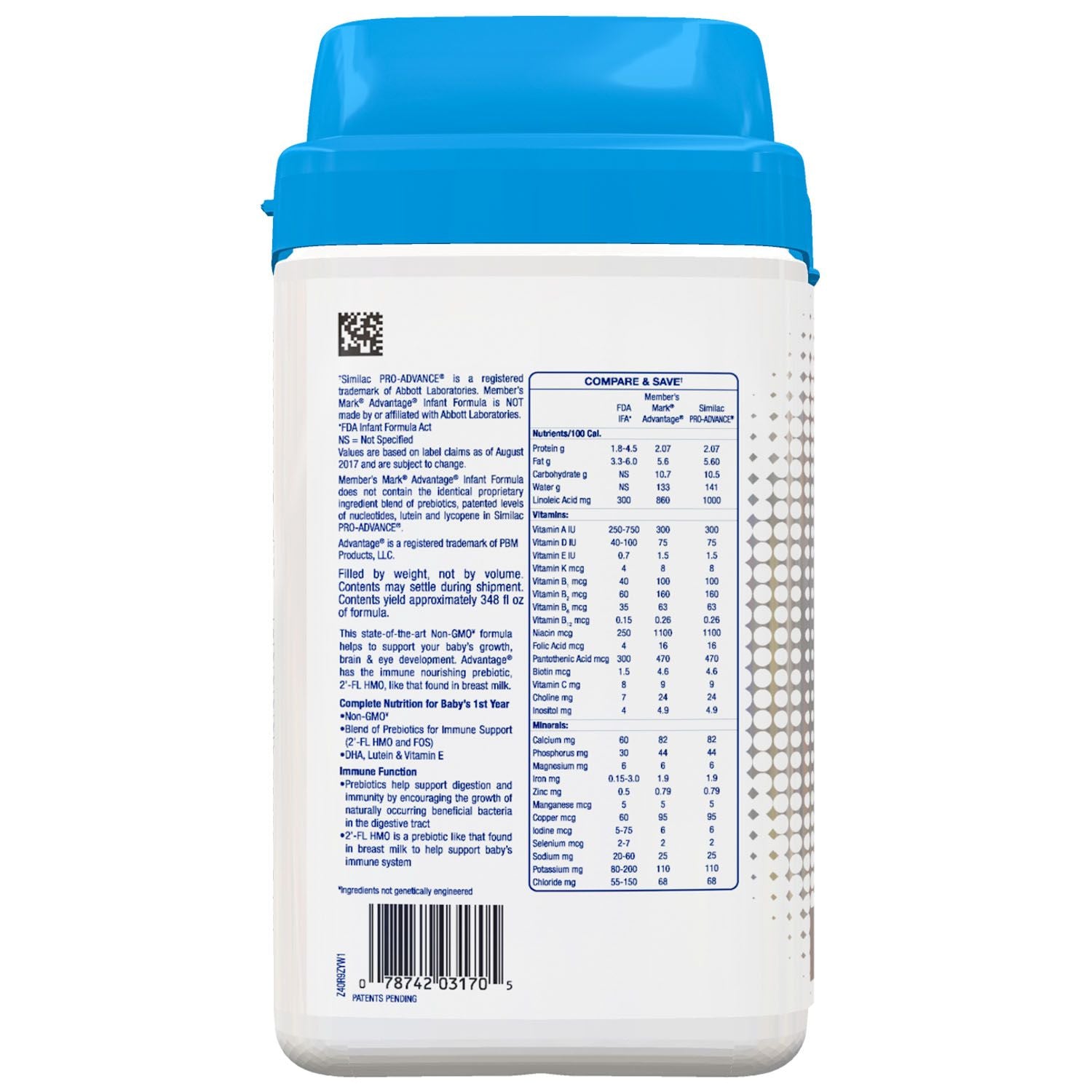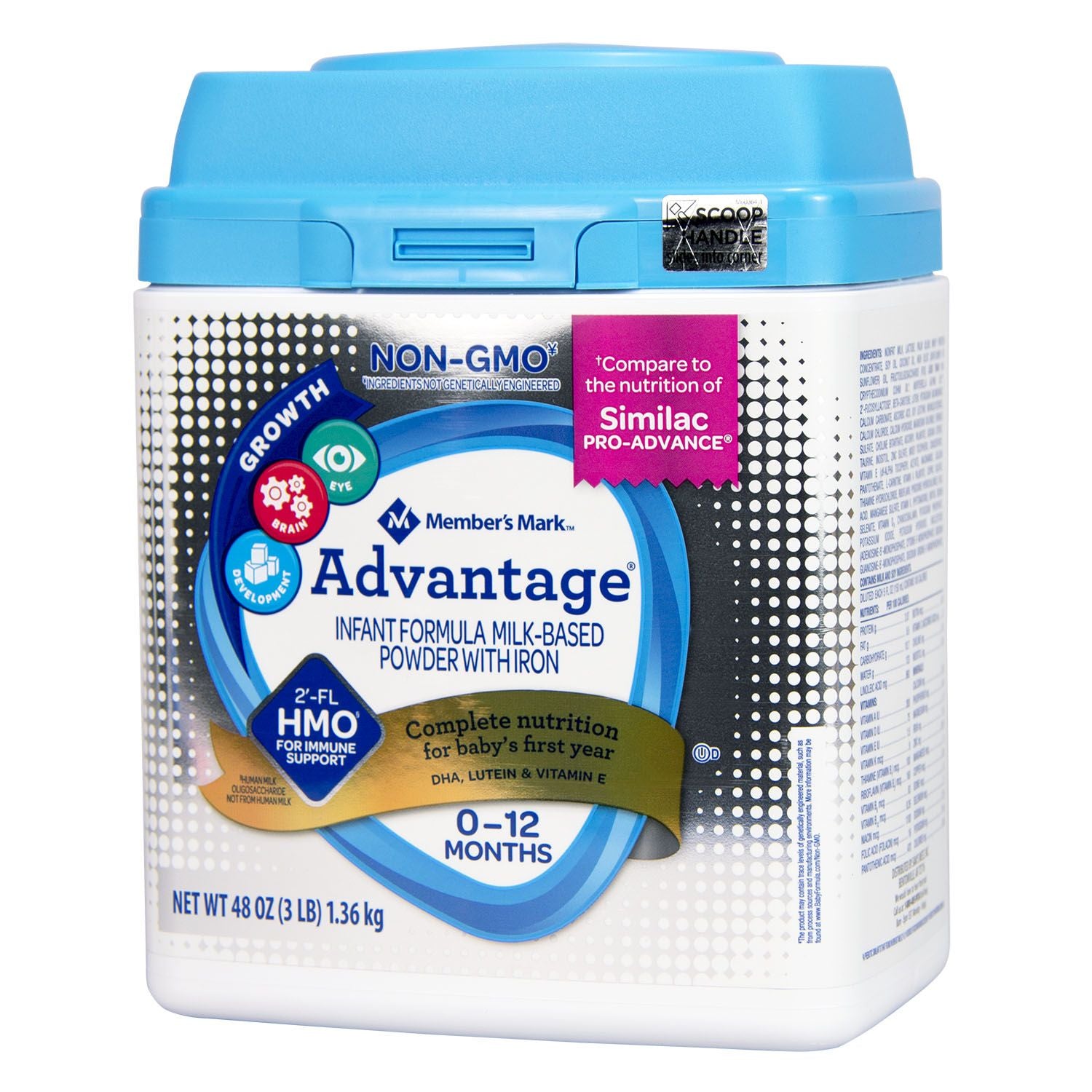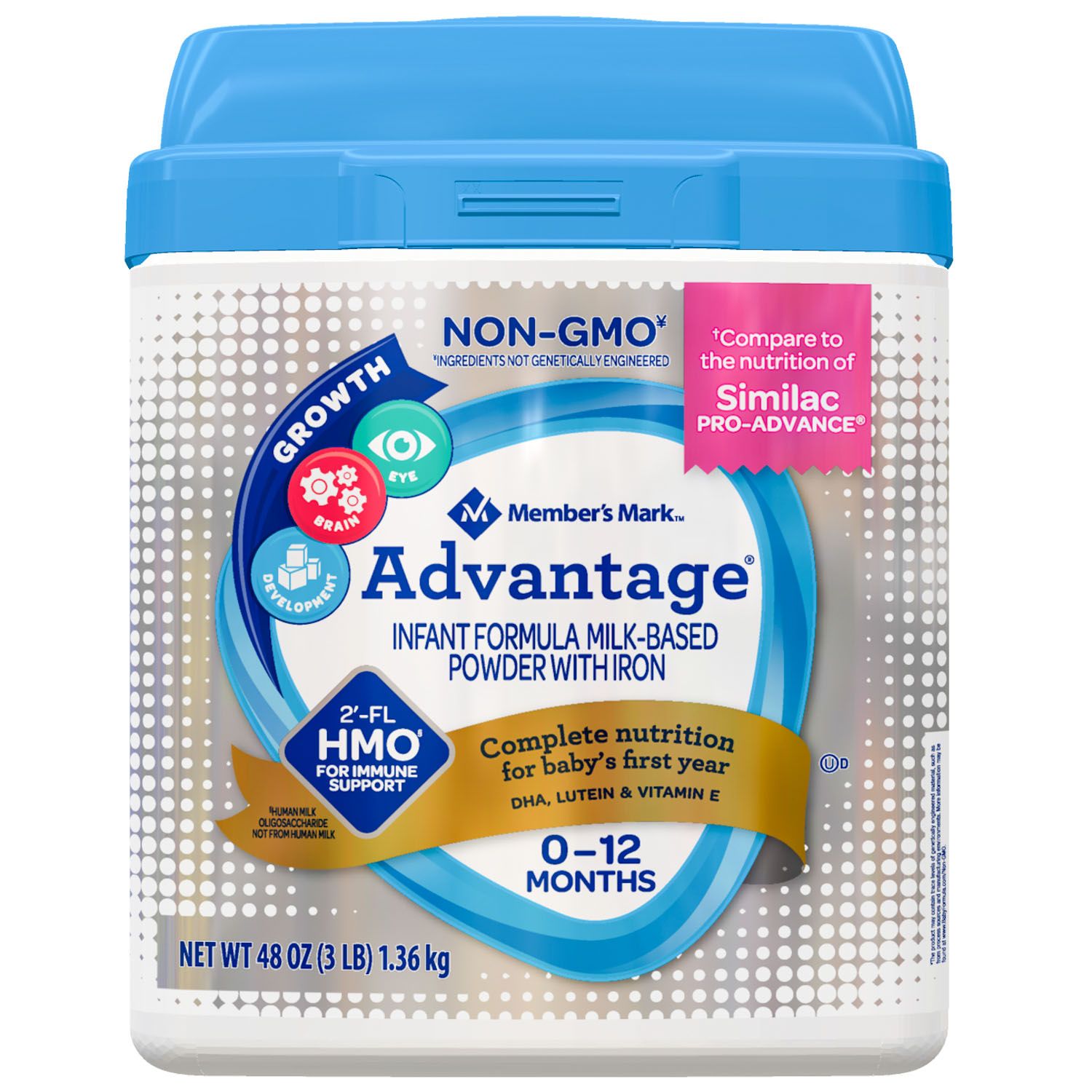 Compare to the nutrition of Similac PRO-ADVANCE™, this Advantage Non-GMO Infant Formula Powder offers a blend of vitamins, probiotics and nutrient, essential for your little one’s growth, brain and eye development in the first year. Gluten free and Non GMO formula, it contains probiotics similar to those found in breast milk for additional immune support.