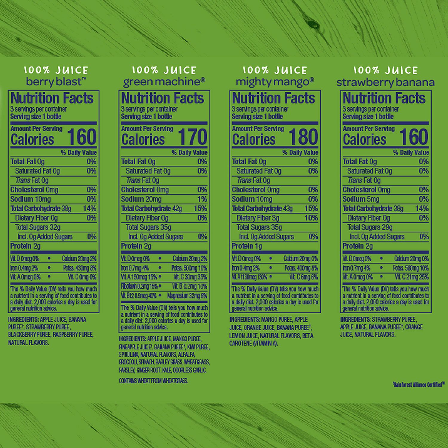 Naked's tasty and nutrient-dense juices are perfect for an "on-the-go" refresh. Take it anywhere with you to get the day's nutrition and feel energized throughout the day. This variety pack includes four flavor favorites: Berry Blast, Green Machine, Mighty Mango and Strawberry Banana.