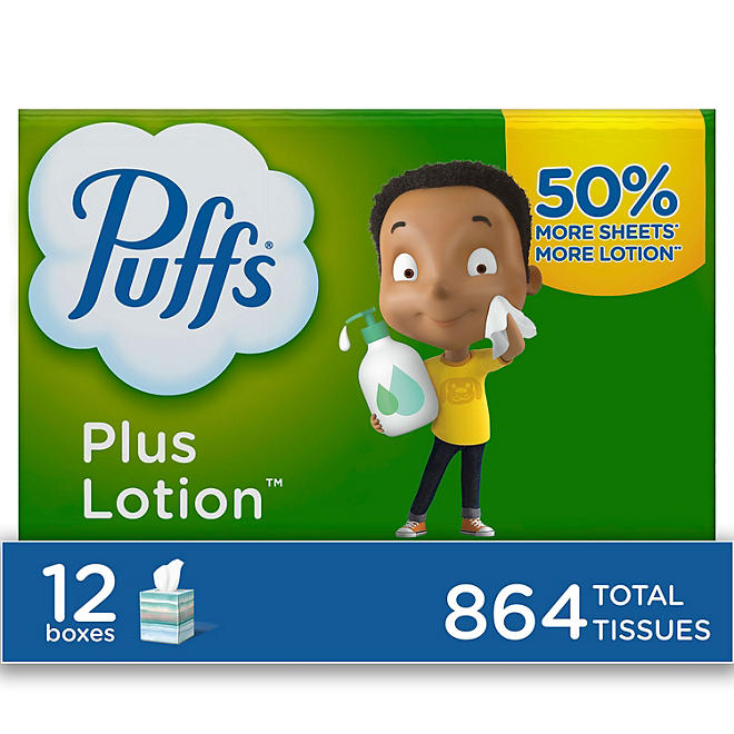 Puffs Plus Lotion 2-Ply Facial Tissues, Cube Boxes (72 tissues/box, 12 boxes)