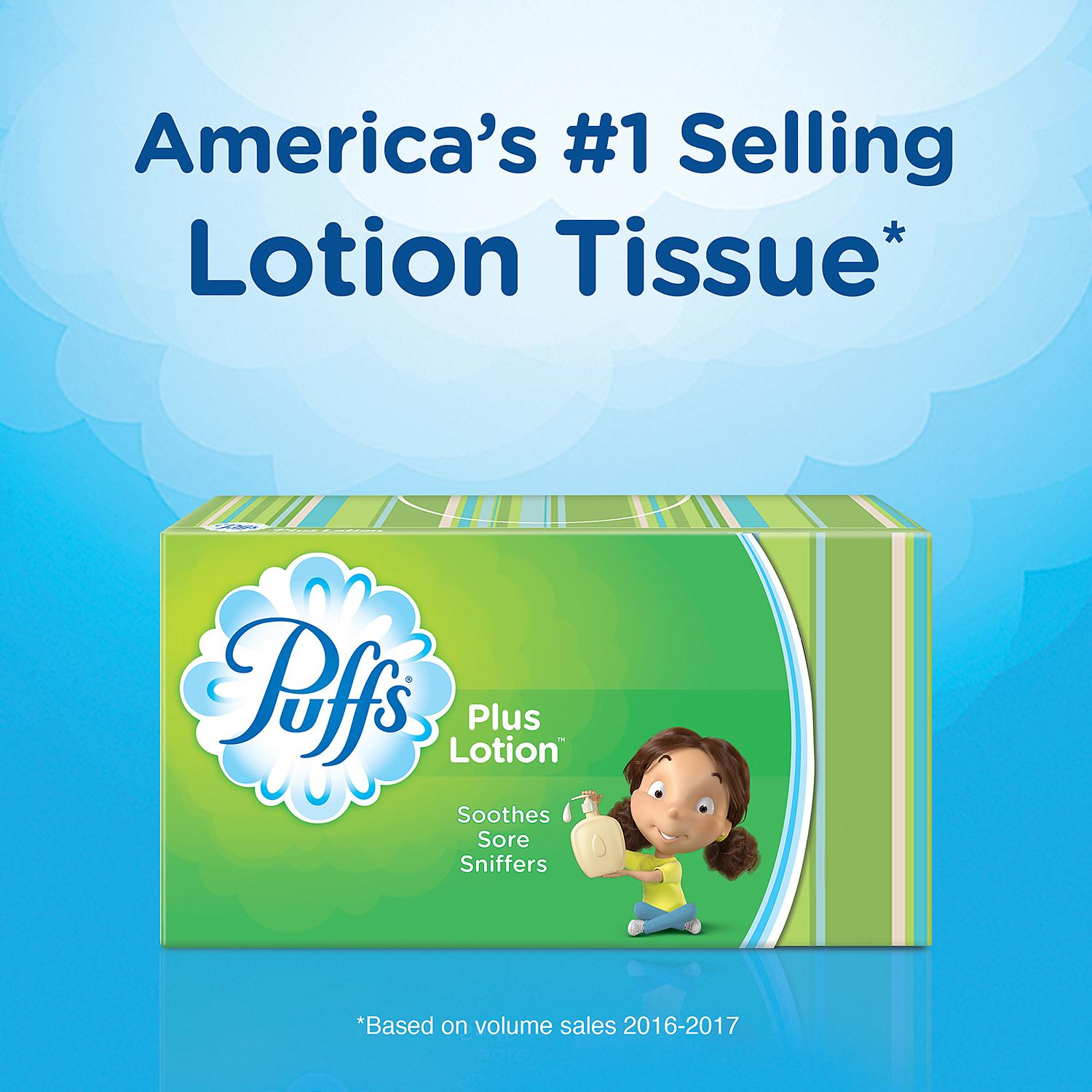 Whether you're sick in bed, suffering from allergies, or just stocking up, Puffs Plus Lotion facial tissues protect noses from turning red. Puffs Plus Lotion is our most soothing* facial tissue with lotion and is offered in a Mega Cube box with 72 sheets per box. Mega cube has 50% more sheets**. Ordinary tissues can leave your nose raw, but no one thinks about the importance of good tissues until their nose is already sore and red. Puffs Plus Lotion is the perfect tissue for when you have a sore or runny nose and are in need of extra softness for any cold, flu, or allergy. Dermatologist-tested to be gentle on sensitive skin, Puffs Plus Lotion facial tissues have air fluffed pillows and lock in moisture better than regular tissues to help soothe the irritated skin commonly caused from rough or thin tissues. Puffs tissues are certified by the Forest Stewardship Council and Preferred by Nature, and made of material from well-managed, FSC-certified forests and other controlled sources. For every tree Puffs uses, at least one is regrown. Puffs cartons are also made from 100% recycled paperboard. It's no wonder that Puffs Plus Lotion is America's #1 selling Lotion Tissue brand, so stock up on Puffs Plus Lotion Family boxes for every room. A nose in need deserves Puffs indeed!