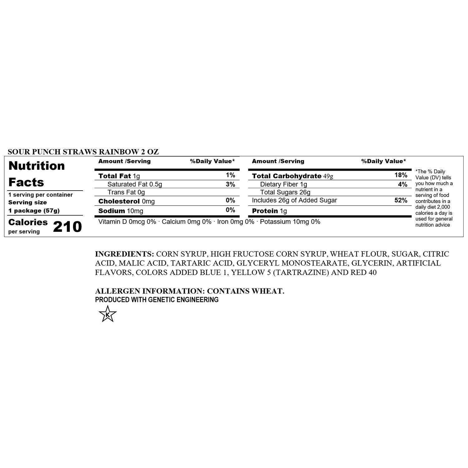 Description: Enjoy a fun and tasty treat with Sour Punch Rainbow Straws in classic 2-ounce packs (24-count). These straw-shaped treats feature the perfect combination of fruity, sweet and sour flavors. Each straw features a signature sour coating with nothing but sweetness underneath. Enjoy snacking on them AND sipping from them! Loved by Consumers of All Ages: Sour Punch Straws are loved by adults and kiddos alike. These candies have been around for three decades and still delight people's taste buds from one generation to the next. Nutrition Information (The Perfect Guilt-Free Snack): The suggested serving size for these Sour Punch Straws is 1 package. Each serving has 210 calories with the total fat equaling 1 gram. Rainbow Sour Punch Straws have no trans fat, no cholesterol and only 49 grams of carbs. Sour Punch Straws are always Kosher certified. Can I Re-Sell These Individually Packaged Straws? Sour Punch Rainbow Straws are ready to be resold. The container can be made into a convenient display box, perfect for concession stands, convenience stores and parties. Stock up and save on all varieties of Sour Punch Straws!