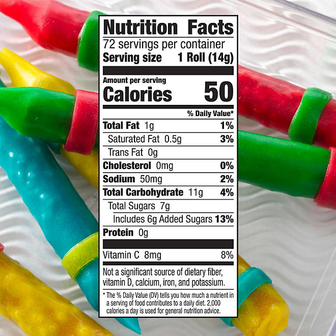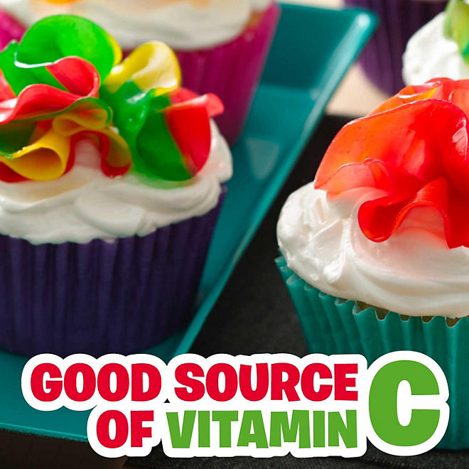 Fruit Roll-Ups Variety Pack features Strawberry and Tropical Tie-Dye flavors. With wild flavors and colors, the possibilities for fun are endless. These individually wrapped snack bags are the perfect treat to include in a packed school lunch box. Each roll comes with an assortment of tongue tattoos for wacky fun. These tasty gummy treats are made without gluten, gelatin or artificial flavors. This variety pack contains vitamin C for snacks you can feel great about. They're the perfect addition to your pantry and a snack every member of the family will love. Contains 72 fruit flavored snack pouches in total.