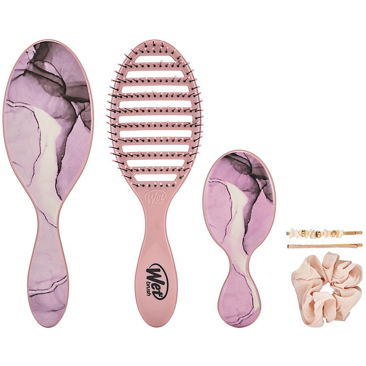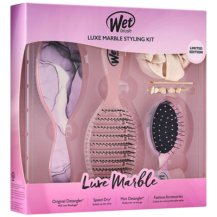 This 6-piece Wetbrush Luxe Styling Kit includes everything you need to luxuriously pamper your hair. The Luxe Marble Original Detangler Brush with ultra-soft IntelliFlex bristles glide through tangles. The brush minimizes pain and protects hair against split ends and breakage*, letting you brush with less force, so you can detangle with less damage to your hair**.